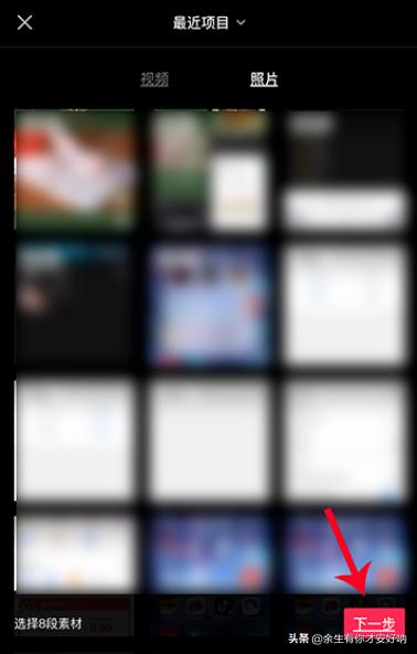 5.进入手机相册后,选择素材点击添加,然后,选择“下一步”。