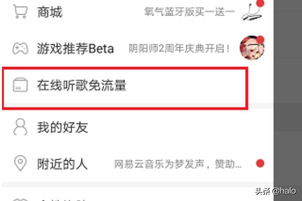 2、第二步打开侧边栏之后,点击在线听歌免流量,如下图所示: